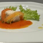 Corvina met courgette, puntparika, artisjok, basilicumolie en tomatenmusseline