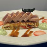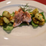 Praline van gemarineerde tonijn, Hollandse garnalen, notensla en kerriemayonaise