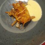 Parelhoenfilet met noten, rozemarijnsaus, aardappelworteltorentje en gefrituurde bloemkool