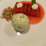 Rijstbavarois, rode wijnijs en gemarineerde pruimen