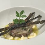 Gerookte paling met stroop, aspergepuree met kervel en uitgebakken spek