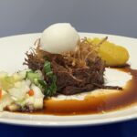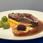 Kalfswang met knolselderie-hazelnotenpuree, tuttifrutti en zwarte pruimen
