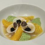 Olijf-artisjokcrème, pancetta, sinaasappelolie en ciabatta met Parmezaansecrème